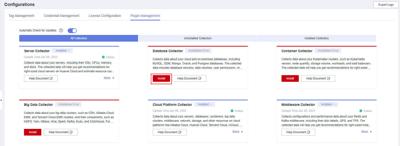 - On the Plugin Management tab page, locate the resource collector you need and click Install.