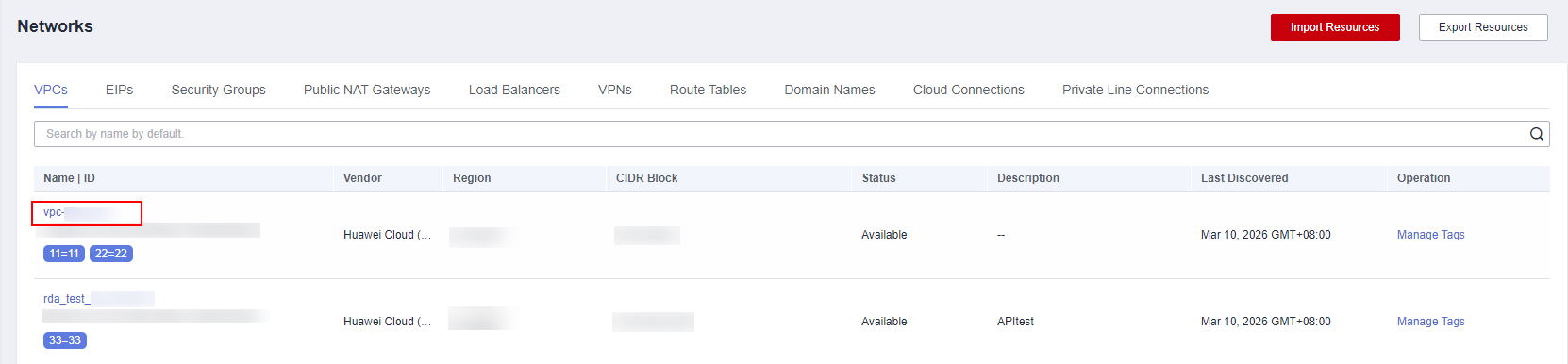 You can view the information about network resources, such as VPNs, VPCs, EIPs, security groups, public NAT gateways, load balancers, domain names, route tables, cloud connections, and private line connections, collected from your platform.