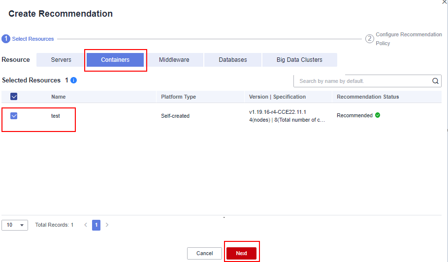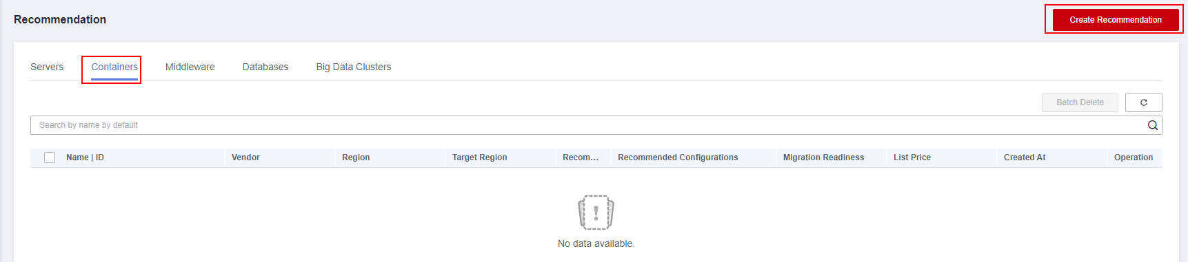 - On the Containers tab page, click Create Recommendation in the upper right corner. Read the message carefully, and click OK.