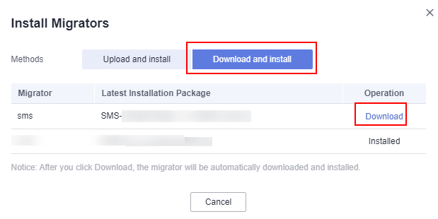 The SMS installation package is downloaded from an OBS bucket on Huawei Cloud over the Internet. The domain name of the OBS bucket is rda-collector.obs.cn-north-4.myhuawecloud.com.