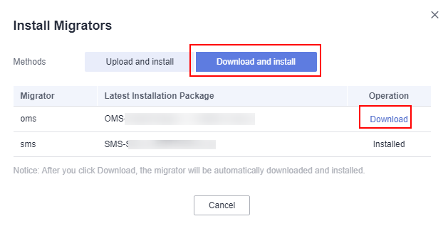 Download and install: Locate the latest OMS plugin installation package, and click Download in the Operation column to download the installation package to the RDA installation directory, for example, C:\RDA.