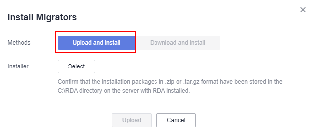 Upload and install: Click Select to upload the OMS plugin installation package. Ensure that the OMS plugin installation package has been stored in the C:\RDA directory of the server where RDA is installed.