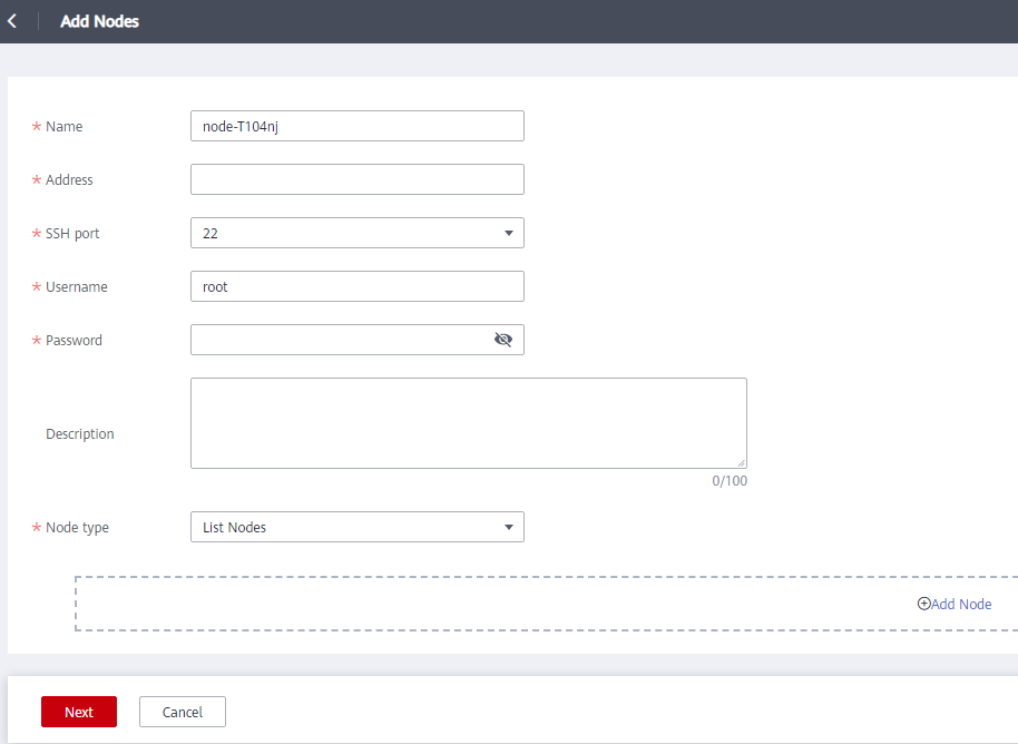 Select List node or Migration node. A list node is used to perform the listing action, and a Migration node is used to perform the migration and comparison actions. A cluster can contain multiple list nodes and migration nodes. CAUTION: