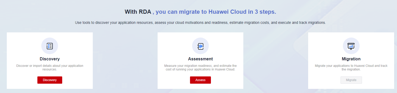 - Migration assessment: RDA can assess the migration readiness of discovered resources and provide the assessment results and improvement suggestions.